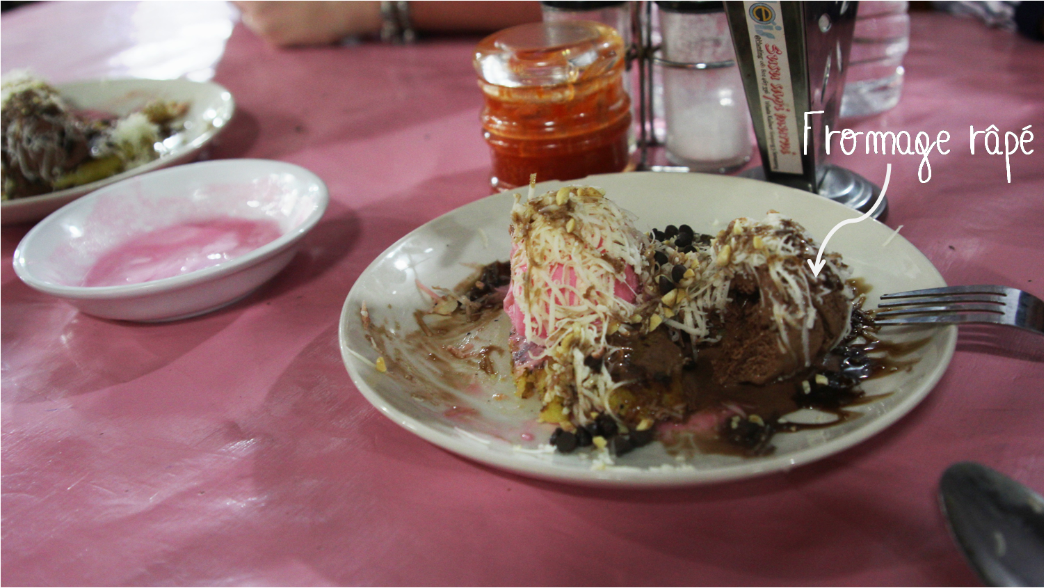 Pour l’anecdote, nous décidons avec Dan de prendre des bananes flambées avec de la glace en dessert. Nous sommes alors très surpris de voir que les jolis filaments blancs sur le dessus ne sont pas de la noix de coco, mais bien du fromage râpé. Le goût est inhabituel mais pas déplaisant : on a tout mangé !