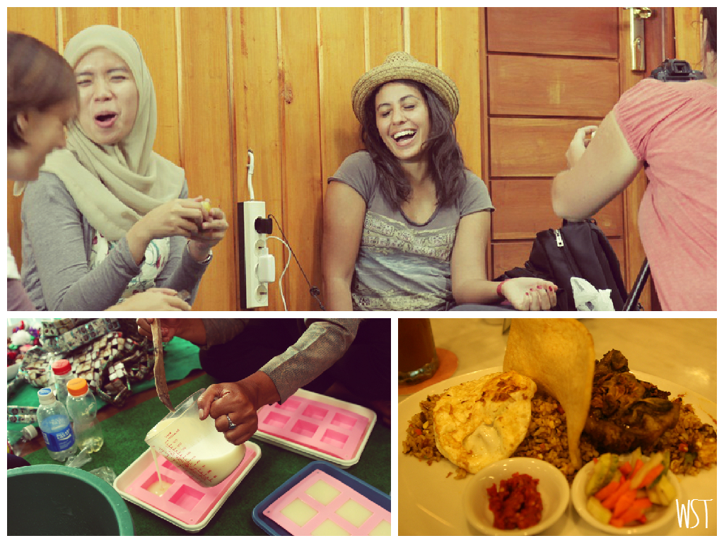 Nous passons donc la journée avec Nadya, qui nous emmène dans le village de Sarongge, pour nous présenter les agricultrices avec qui elle mène son dernier partenariat, qui produisent des savons naturels à la citronnelle et au café. Nous assistons d’ailleurs à une démonstration, et Nadya elle-même est très impressionnée : elles n’utilisent pas de thermomètre ni aucun instruments nécessitant de l’électricité. Elles battent la préparation avec un fouet pendant un temps qui semble interminable, et on a mal aux bras pour elles. D’ailleurs, Sarah tente l’expérience et ne dure pas très longtemps !